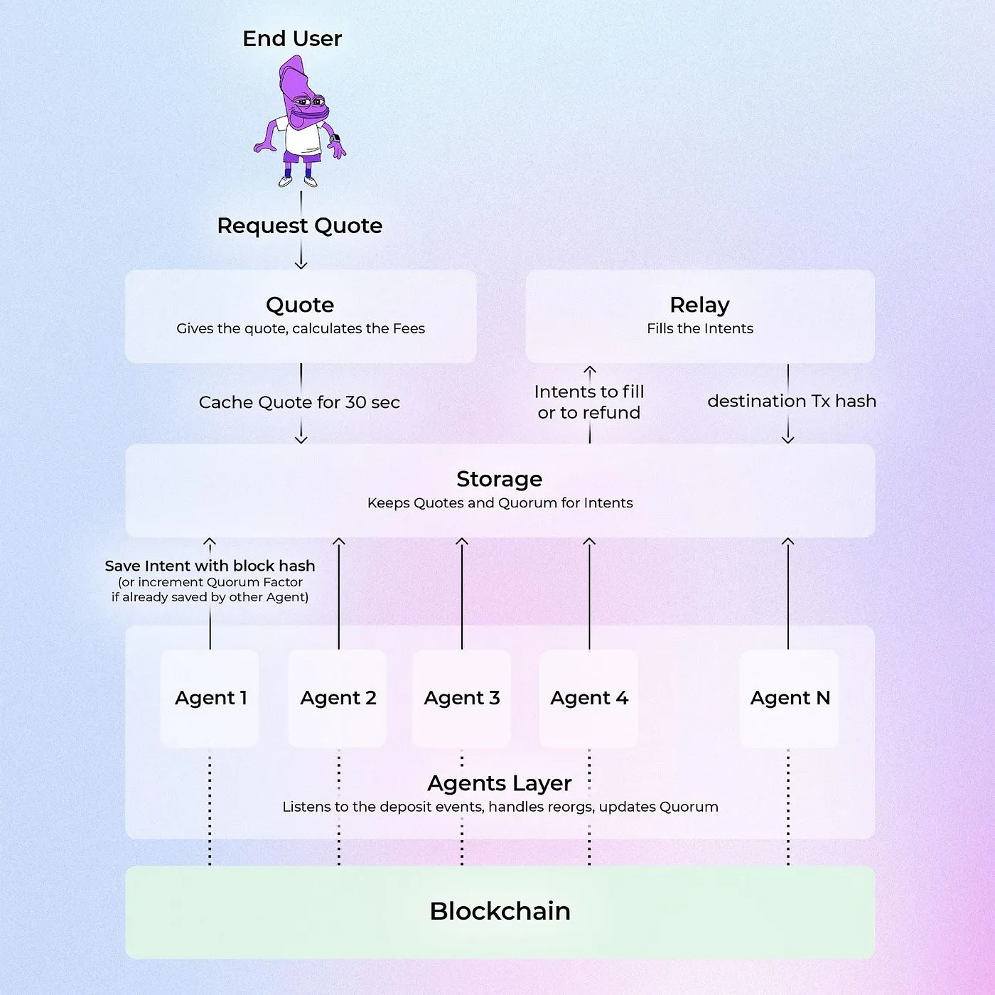 * Solvers handle the heavy lifting of bridging, locking assets on the source chain, and releasing liquidity on the destination chain—ensuring fast and cost-effective transactions.